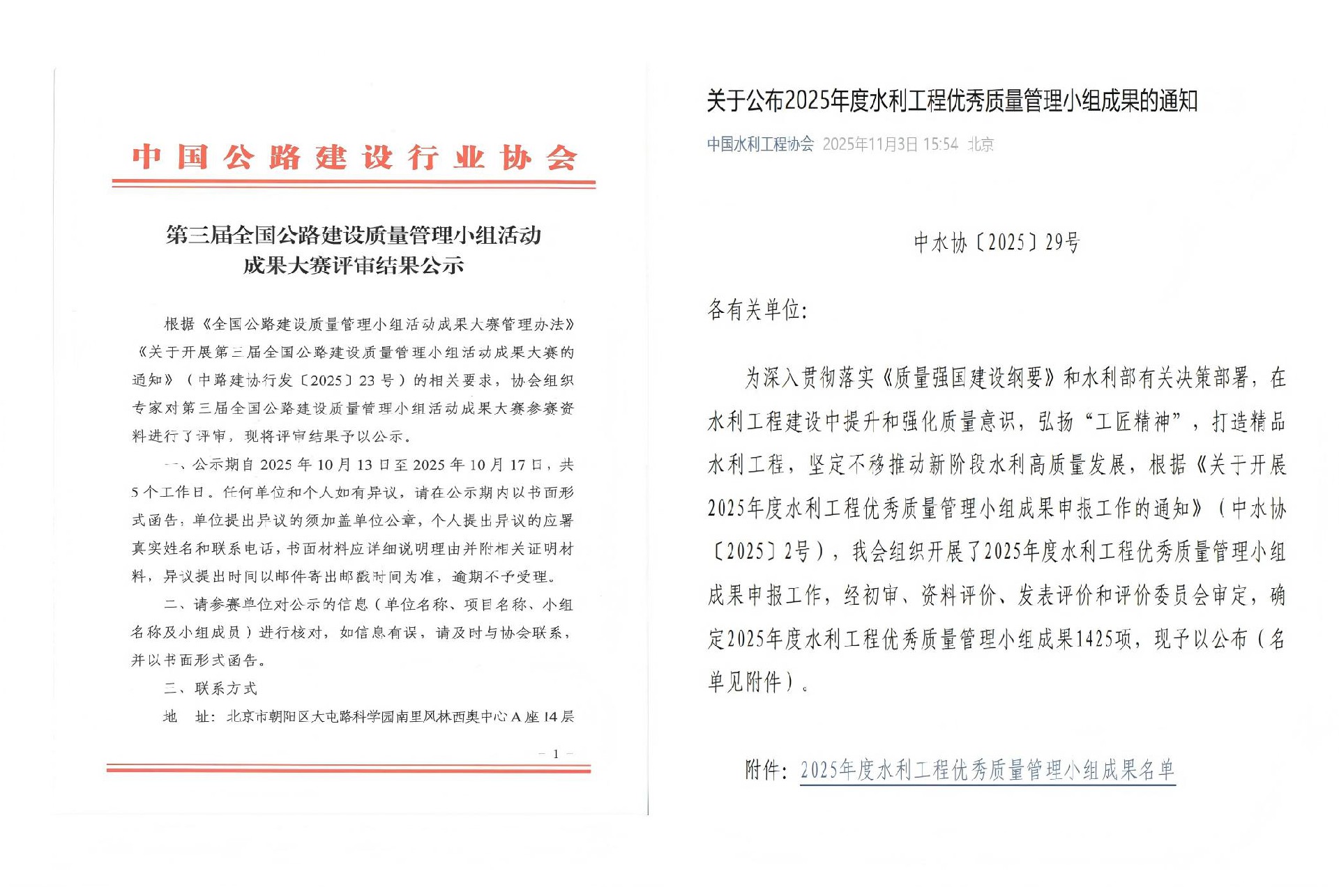 近日,中國公路建設(shè)行業(yè)協(xié)會(huì)、中國水利工程協(xié)會(huì)先后公布了第三屆全國公路建設(shè)質(zhì)量管理小組活動(dòng)成果評(píng)審結(jié)果和2025年度水利企業(yè)質(zhì)量管理小組競賽活動(dòng)結(jié)果。“···